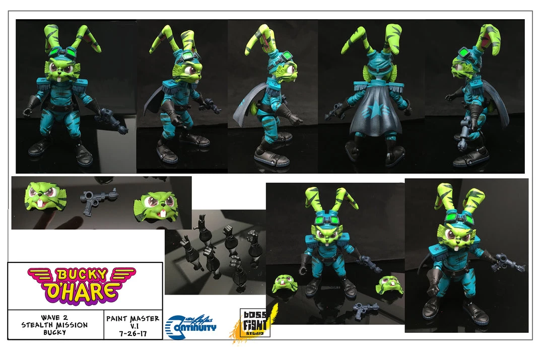 Stealth Mission Bucky O’Hare has new “Stealth Mission” deco, 20 points of articulation, three interchangeable faces, six interchangeable hands, and two laser pistols! He comes packaged in a resealable blister card with classic Bucky artwork and bio!