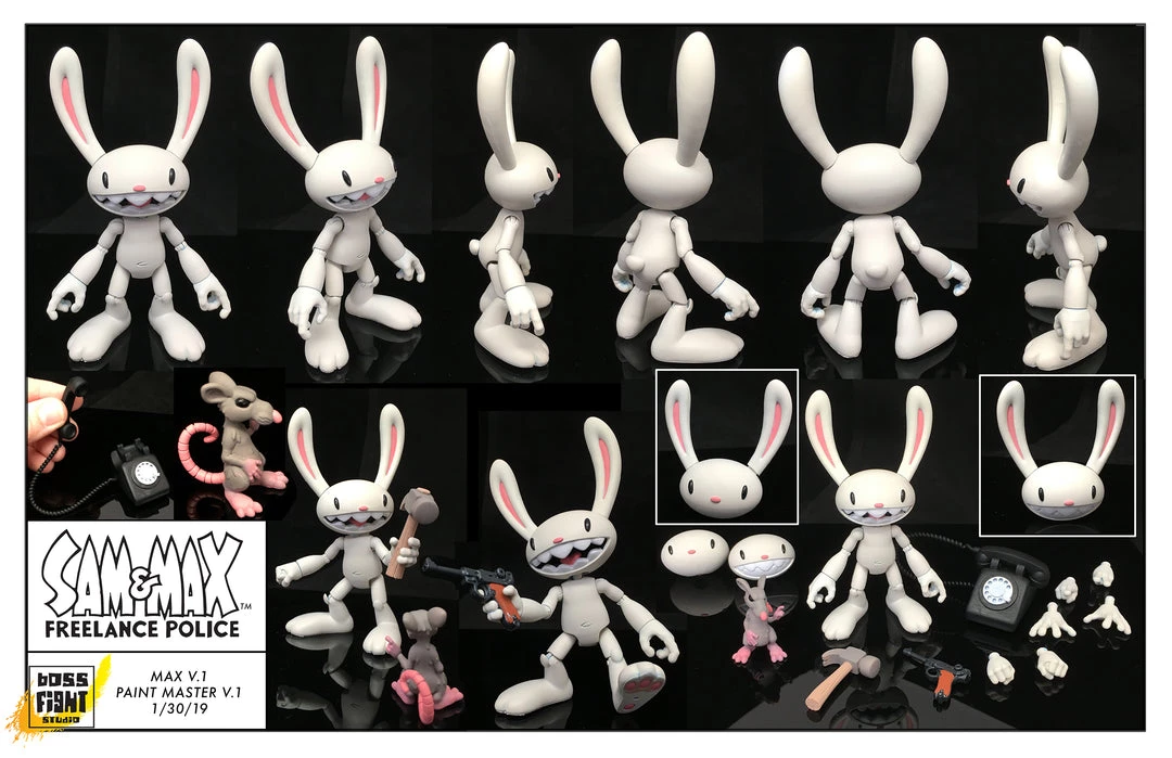 Max the Rabbity Thing is packaged in a deluxe window box featuring new illustrations by creator, Steve Purcell. Max features 11 points of articulation, interchangeable heads, hands, rotary-dial phone, pistol, hammer, & a rat.
